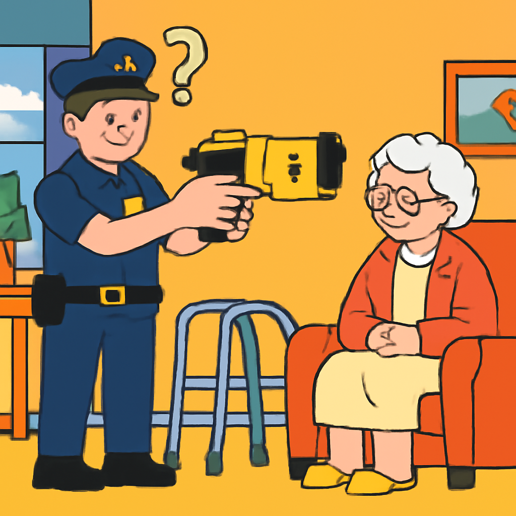 Once upon a time, a policeman named Kristian did a big oopsie with his taser. There was a very old lady, Clare, who needed a walker to move around. One day, she was at her home for older people when the policeman thought he needed to use his zapper. But Clare was just a sweet granny who couldn’t move fast. People got very upset because they said Kristian should have been more careful. The court had to decide what to do next with Kristian to make sure everyone learns to be gentle and careful. And that’s the moral to the story. ⚖️👵⚡
