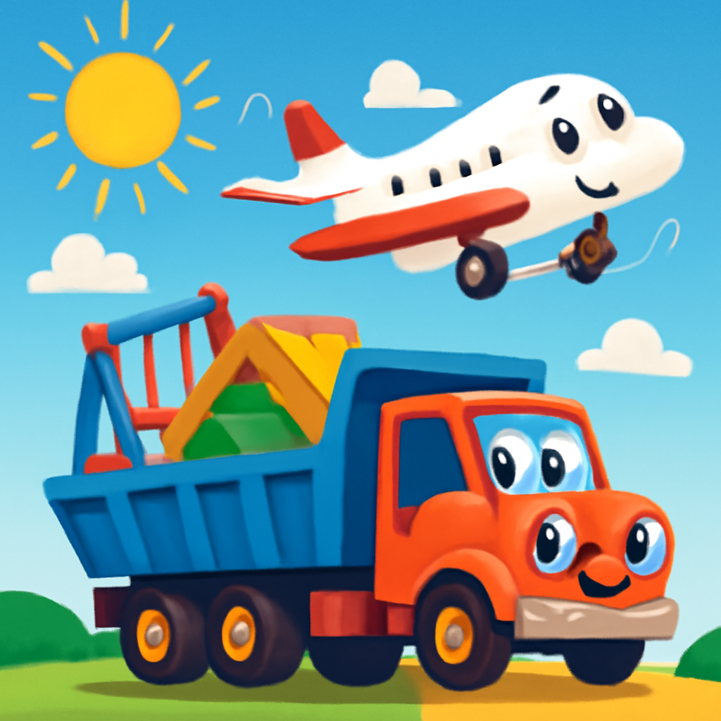 Once upon a time, there was a big truck and a big plane. They were friends and loved to help everyone. One day, they decided to build a playground for all their friends. The truck carried big toys, and the plane flew high to find the best spot. Together, they made a fun place for everyone to play. The sun was shining, and everyone was happy. In the end, the friends learned that working together makes everything better. And that was the moral to the story. ๐๐โ๏ธ
