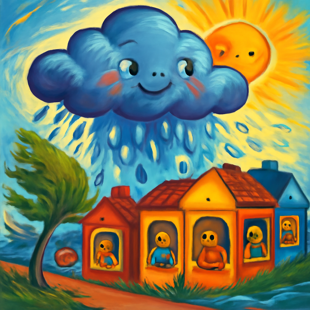 Once upon a time, there was a big rain cloud over the coast. The rain cloud wanted to play and splashed lots of water everywhere! People needed to close windows and hold onto their hats because the wind was strong. Everyone stayed safe inside with toys and books. By the end of the day, the sun peeked out, and everyone learned it’s good to be ready for rainy days. 🌦️ That’s the moral to the story.