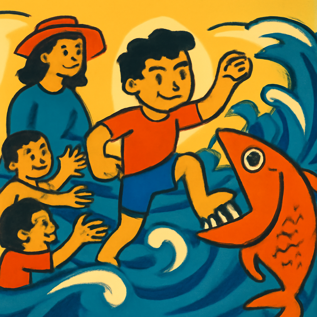 Once upon a time, a brave boy was splashing in the water when a big fish with sharp teeth tried to nibble him! But guess what? The boy kicked the fish away, twice! ๐ฆ His friends quickly helped him out of the water, and a nice lady helped make him all better. Everyone was super brave and calm, and soon the boy was smiling again. The town was a bit scared, but they knew the ocean would be safe again soon. And that’s the moral to the story. ๐๏ธ