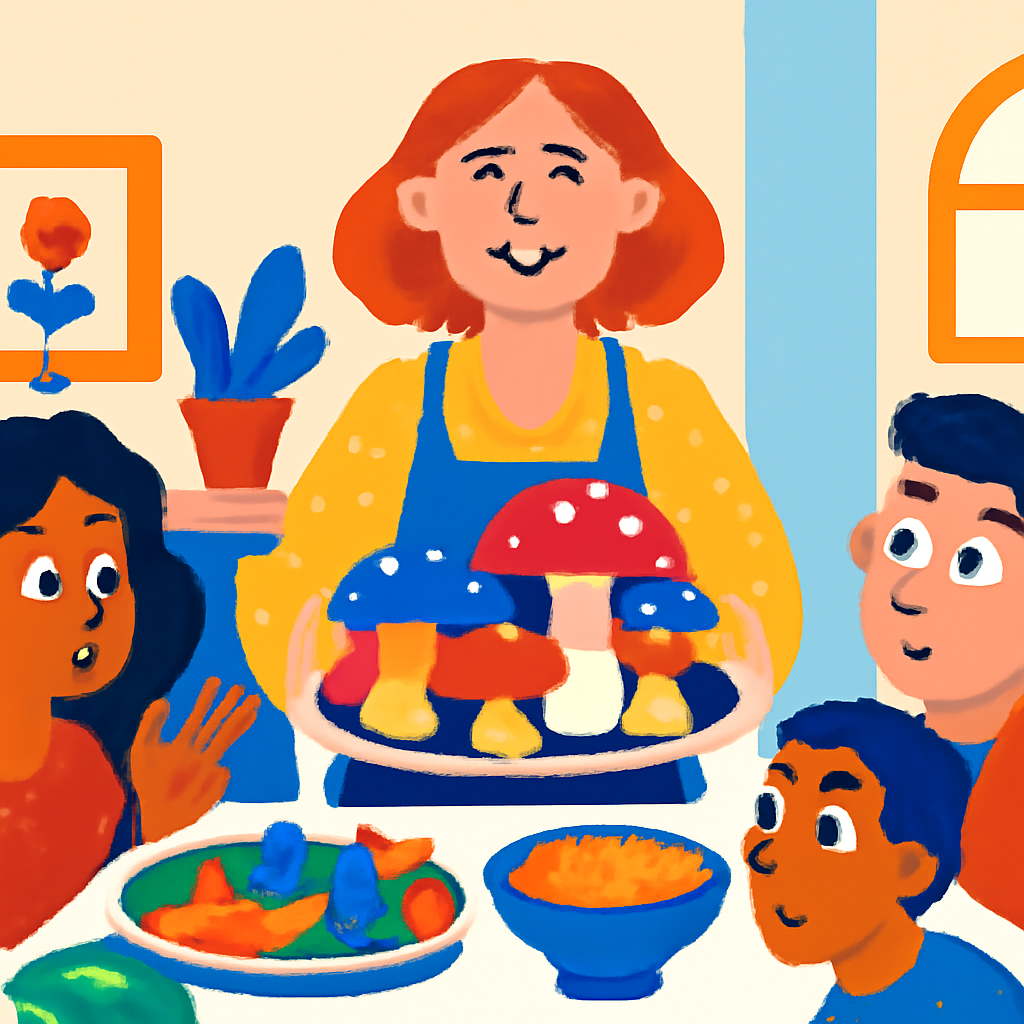 Once upon a time, Erin hosted a lunch at her cozy home. She made a special dish with mushrooms, not knowing a mix-up would follow. Her guests enjoyed their meal, but soon felt unwell. Erin, worried, discovered the mushrooms might have been dangerous. This led to questions and a story of caution. Moral to the story: Always know what you cook with. ๐๐