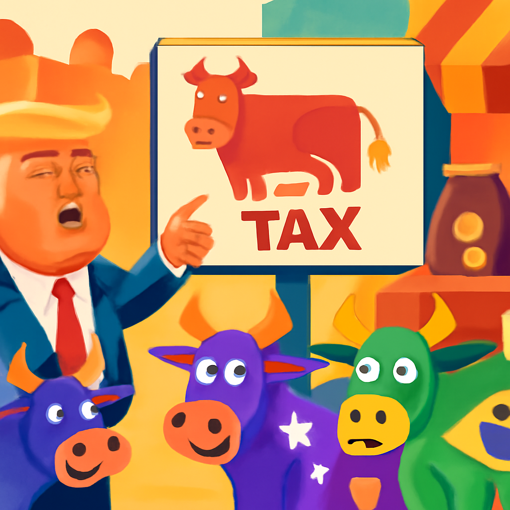 Once upon a time, there was a big leader named Trump who wanted to make beef prices go up. He said to a faraway land called Brazil that their beef had to pay a big tax to come to his land. This made the cows from Australia very happy because they might get picked instead! But oh no, the people in Trump’s land might have to pay more for their coffee and orange juice too. And that’s the moral to the story! ๐๐ฅค