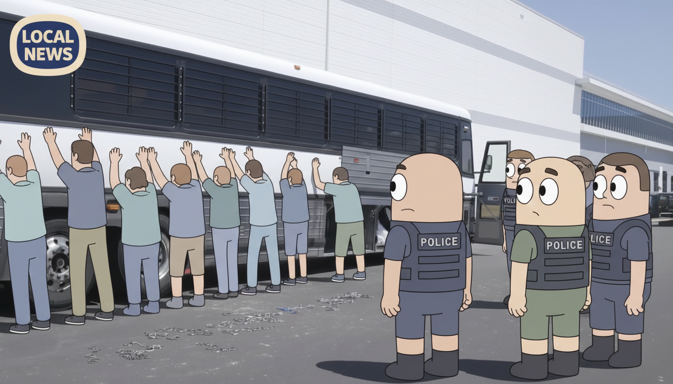 Once upon a time, in a place called Georgia, lots of police visited a big car battery house. ๐Ÿš“ They found many people who came from far away places. Some were hiding in a pond! ๐ŸŸ The police took them on big buses, but no one was in trouble yet. Everyone was talking about it. The moral of the story is sometimes big actions can make big waves.